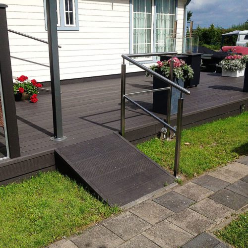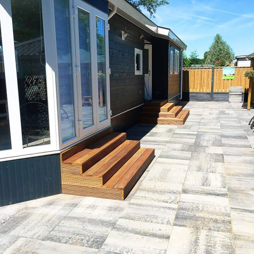 Aanleg van een terras aan of rondom uw chalet met bijvoorbeeld een trapje of schuin aflopend plateau is bij ons ook mogelijk. Hiervoor komen we graag op locatie en nemen we samen met u uw wensen door. U heeft hierbij de keuze uit een onderhoudsarm terras met de bamboe composiet terrasplanken van Bacodeck of voor een traditioneel (hard)houten terras.